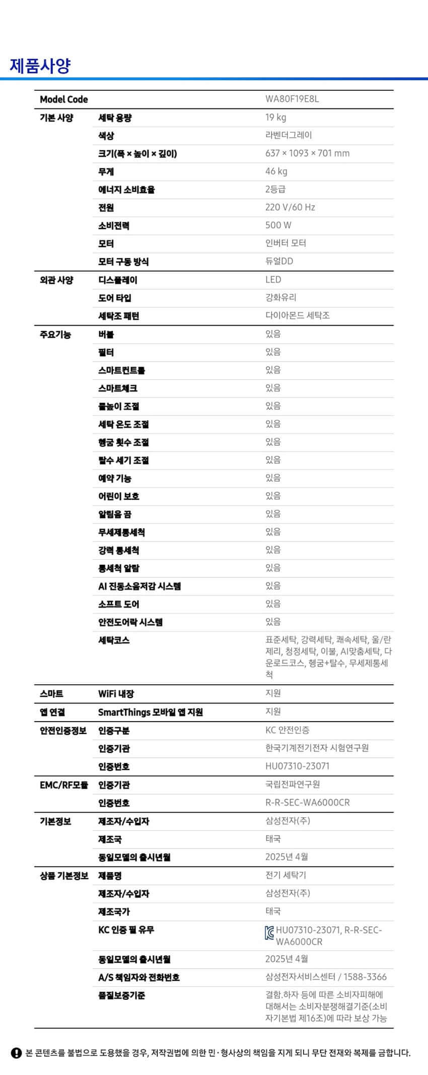 [삼성] 그랑데 AI 통버블 세탁기 라벤더그레이 WA80F19E8L